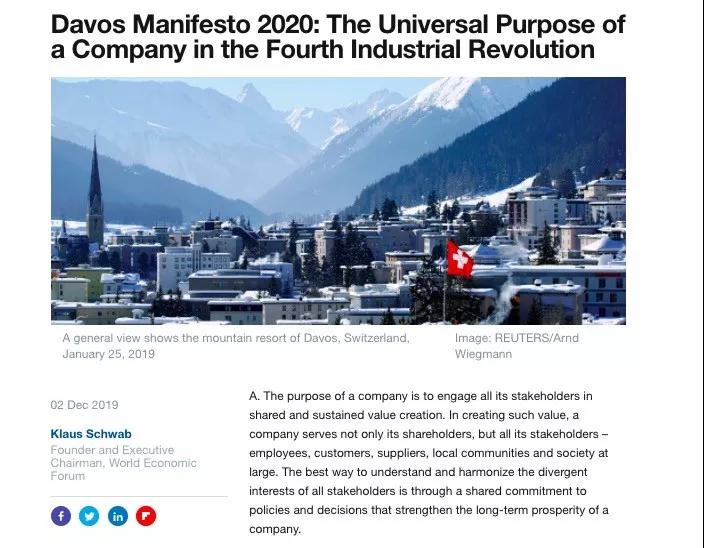 “這是世界經(jīng)濟(jì)論壇50年前成立的初衷,”施瓦布堅(jiān)信,“也是我們在未來50年努力的方向。” 大公司已開始重新思考自己的價值。