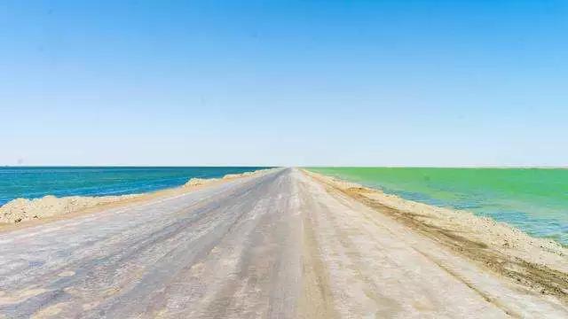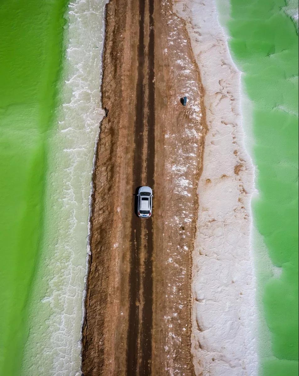 東臺吉乃爾湖的神奇之處在于一條泥路將湖水一分為二,一半是純正的蒂芙尼藍,一半是含鹽量極高的純粹綠;乃爾湖岸邊盡是覆蓋著的白色結晶,湖周圍是大片的雅丹地貌,搭配上顏色干凈到極致的湖水、西北特有的廣闊無垠的天空,純粹而強烈的視覺沖擊,這方圓百里大漠戈壁無人區的珍寶明珠,這只屬于大自然的神秘顏色,讓你仿若來到了世界的盡頭,讓你感受一種歸于自然的內心平靜。