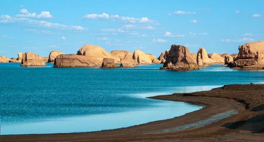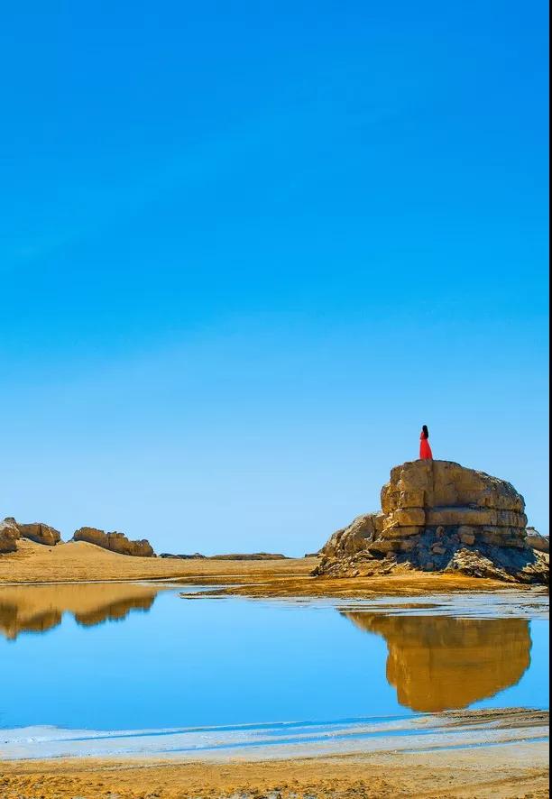 這是世界上唯一一處水上雅丹地貌,因其位置較偏僻,即使是當地人也可能不知怎么過去,所以至今仍是一片未開發的處女地,鮮少有人涉足。這立于汪洋之上的雅丹地貌群經過上千年的風雨殘蝕,如同遨游大海顯露脊背的群鯨,湖岸邊高大的鯨背是天然的觀景臺,極目遠望,西邊是高低錯落的水上雅丹地貌群,有的如策馬揚鞭,有的如奔馳的駱駝,有的像婀娜多姿的女子,魔幻而神秘。以清澈透明的藍天為幕,參差錯落的雅丹地貌與碧波交相輝映,天上鴨鳴雁啼,水中波光粼粼,這一望無際的荒漠中憑空而出了一片”汪洋“,只有親身看過這一片汪洋上的鬼斧神工之作,才會明白為它為什么會被人稱為“魔鬼城”。