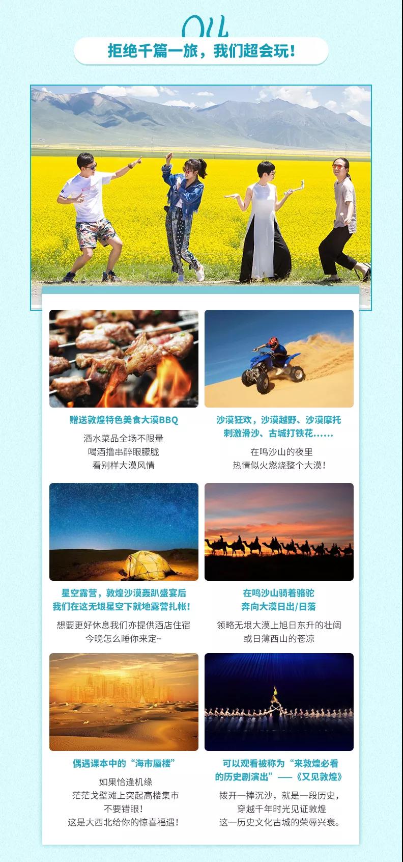 溫馨提示:西北地區天氣干燥,旅途的過程中請大家多喝水,注意防曬;敦煌《又見敦煌》演出,旅游淡季298元/人,旺季368元/人起;果木烤全羊費用根據羊的大小決定,由參與活動的游客均攤,一般10人一桌,人均消費160元左右。