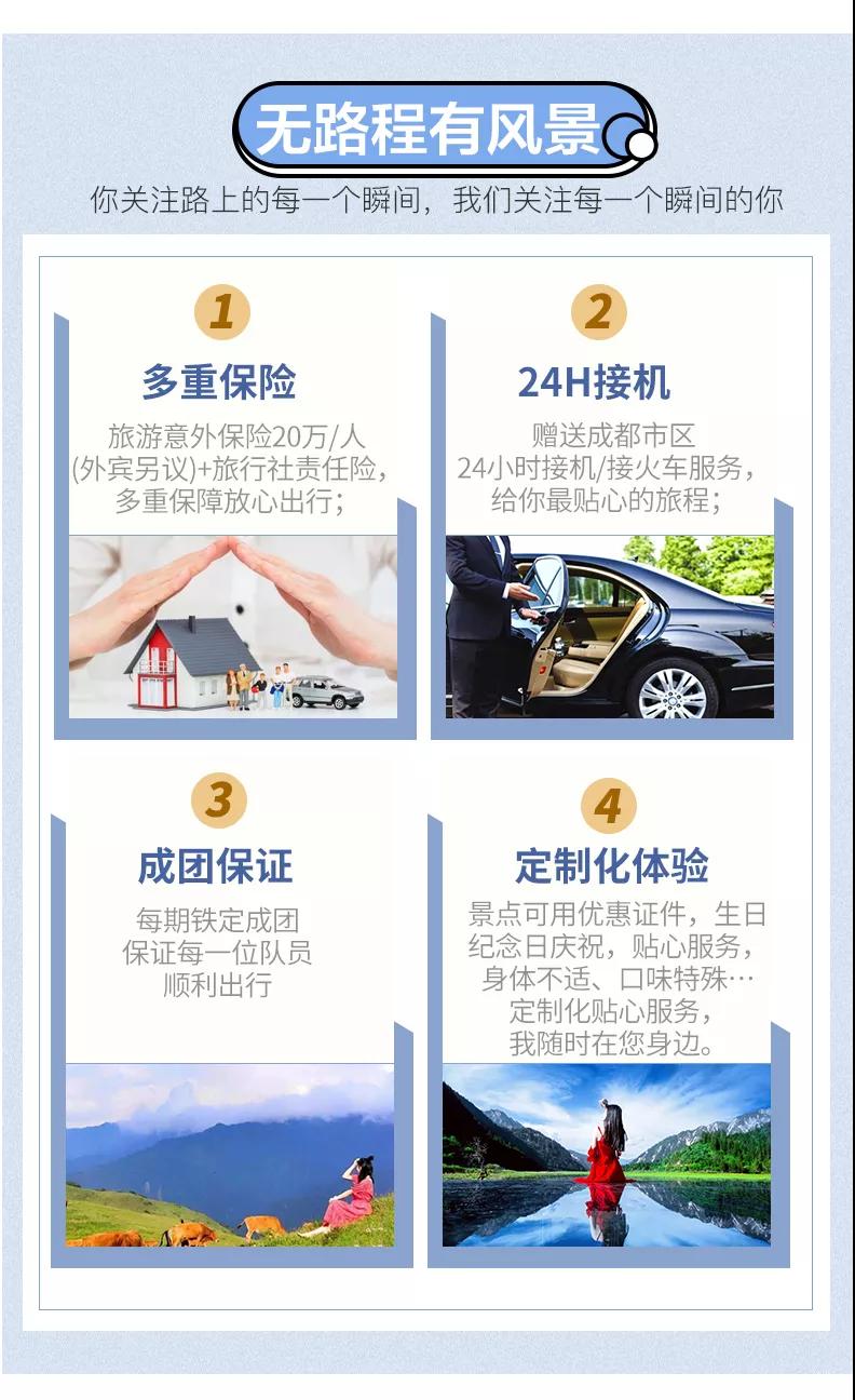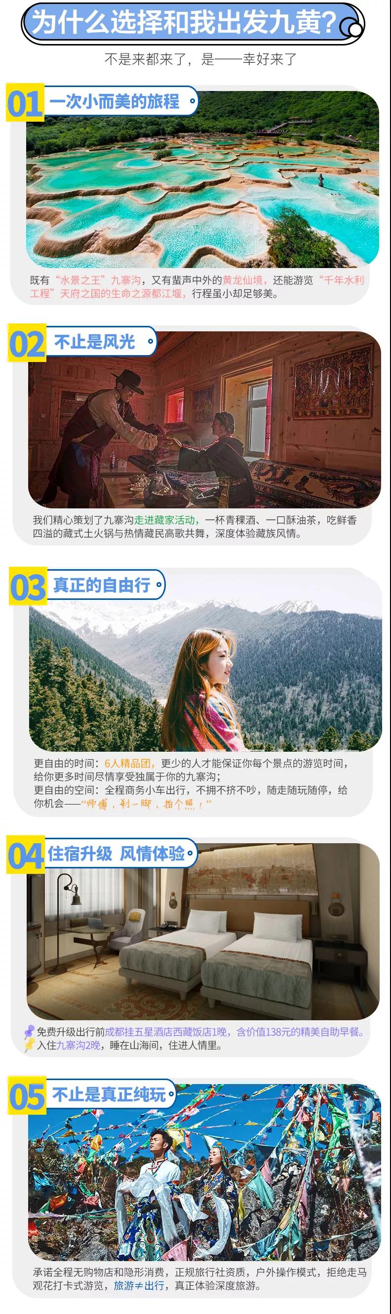 3、九寨溝面積較大游客需求不一,因此主要以游客自助游形式游覽,如無導游陪同望您諒解。游覽開始前導游會與您約定好集合時間,請務必按時到達指定地點,避免耽誤大家接下來的行程;