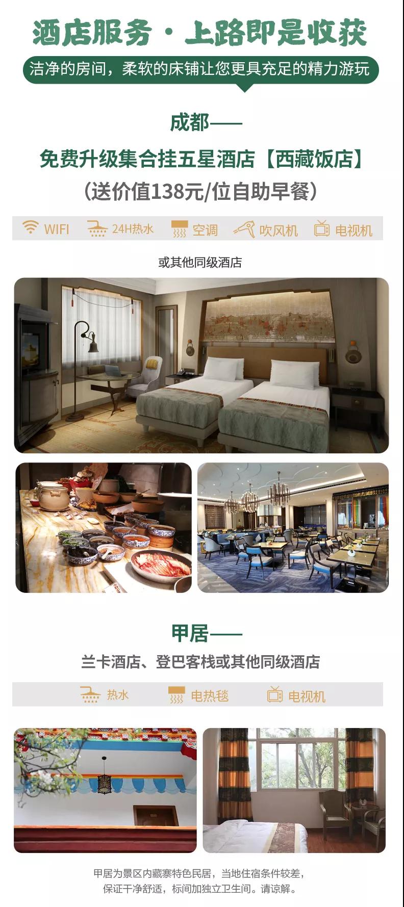 住宿:6晚當地精品酒店雙人標間+免費升級一晚成都集合掛五酒店雙人標間,確保酒店干凈衛生,溫馨舒適。因沿途高原藏區條件有限,如果酒店設施沒有達到您的期望,敬請諒解。參考酒店如下: