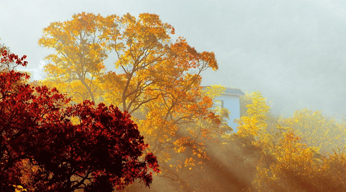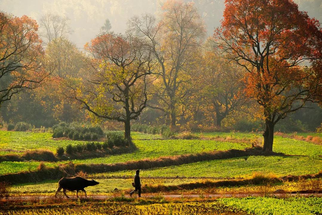 塔川烏桕樹經(jīng)過霜降,由綠變黃,由黃變紅,漸變出調(diào)色板般豐富的色彩。塔川的清晨極美,薄薄的霧氣似有似無,籠罩在山腰,林間,農(nóng)家的小屋若隱若現(xiàn),紅楓叢中小露飛檐翹角,黃葉微隙掩映粉墻黛瓦,如中國山水畫般詩情畫意。