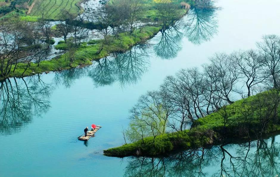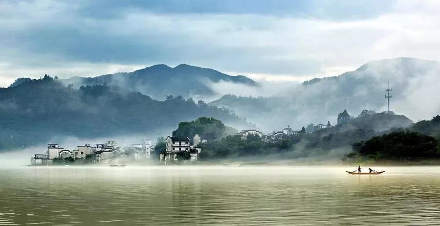 月亮灣依山伴水,水面平靜如鏡。一兩葉小舟,遠(yuǎn)遠(yuǎn)近近高低錯落的徽派民居互相輝映,形成了一幅絕美的畫面。