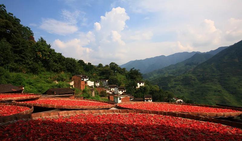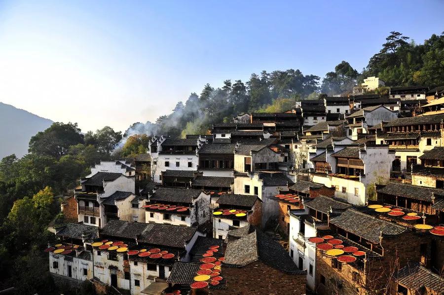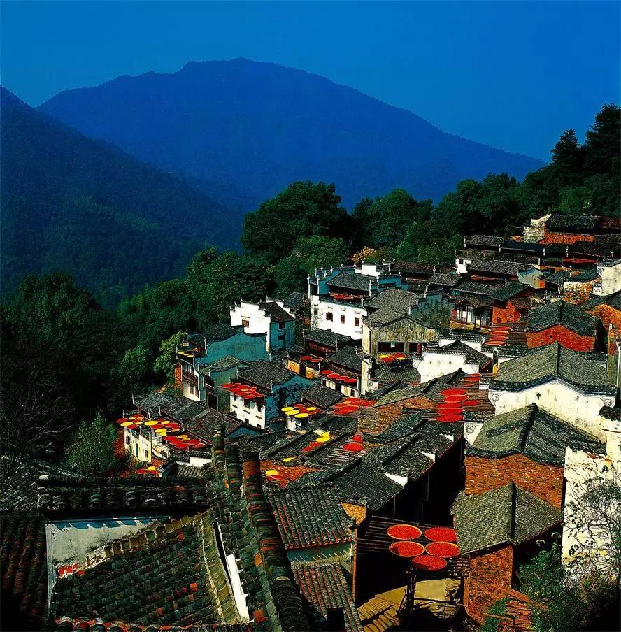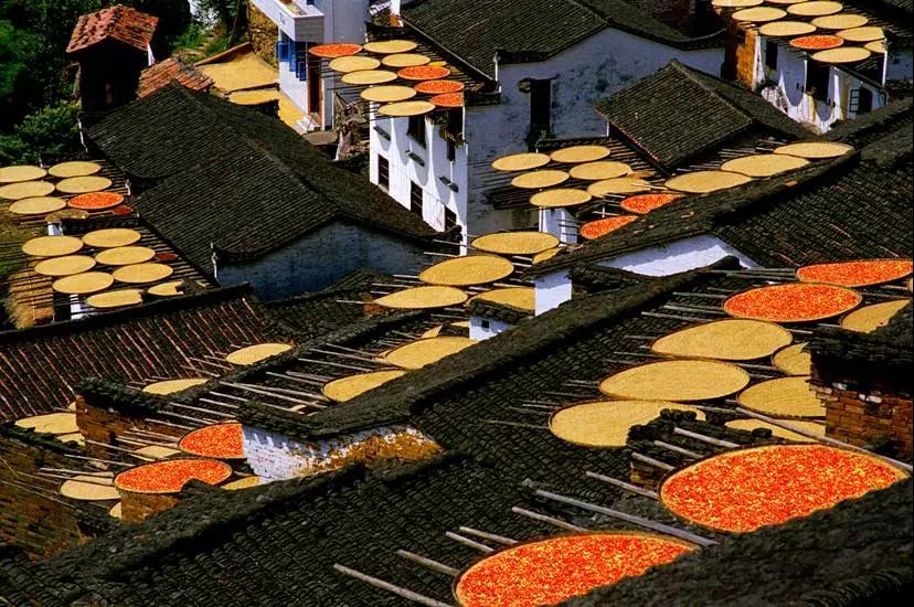 篁嶺的秋天不是北方漫天遍野的金黃,而是晾曬在屋頂?shù)娜宋那锷?
