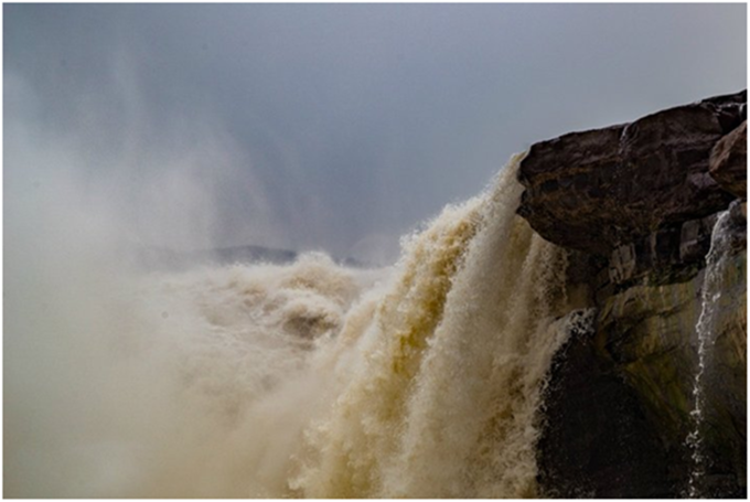 由于壺口瀑布的特殊地勢,千萬支流匯成的黃河在壺口處瞬間被壓縮到20米左右的寬度,水流急速傾下,形成激流飛瀑。聲音如同獅吼,黃河大合唱便是由此感觸而發。
