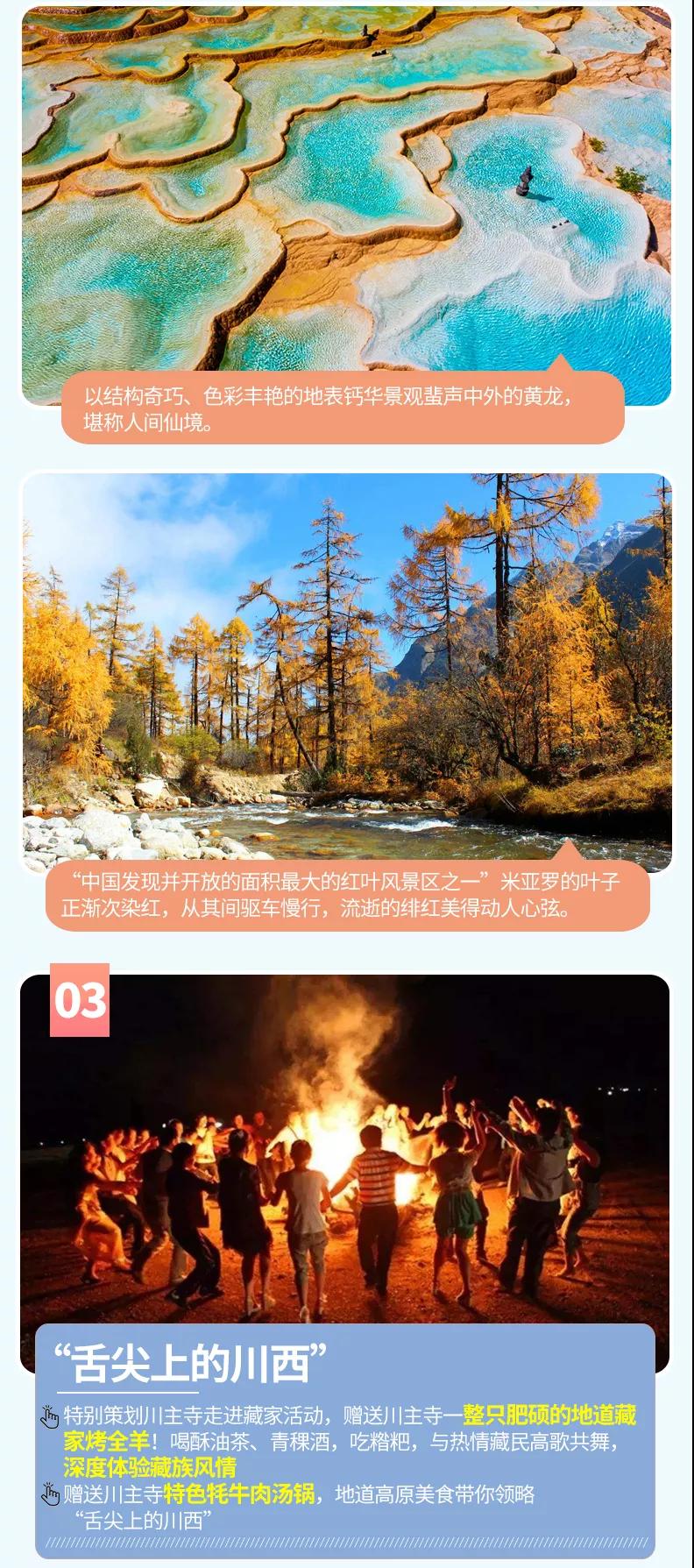 3、九寨溝面積較大游客需求不一,因此主要以游客自助游形式游覽,如無導游陪同望您諒解。游覽開始前導游會與您約定好集合時間,請務必按時到達指定地點,避免耽誤大家接下來的行程;