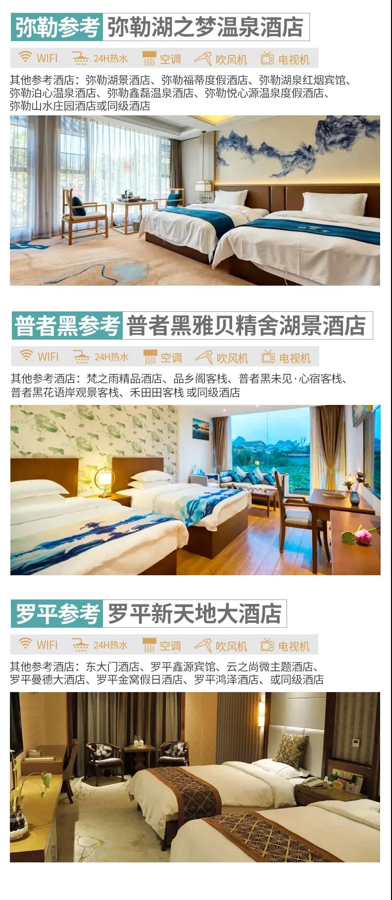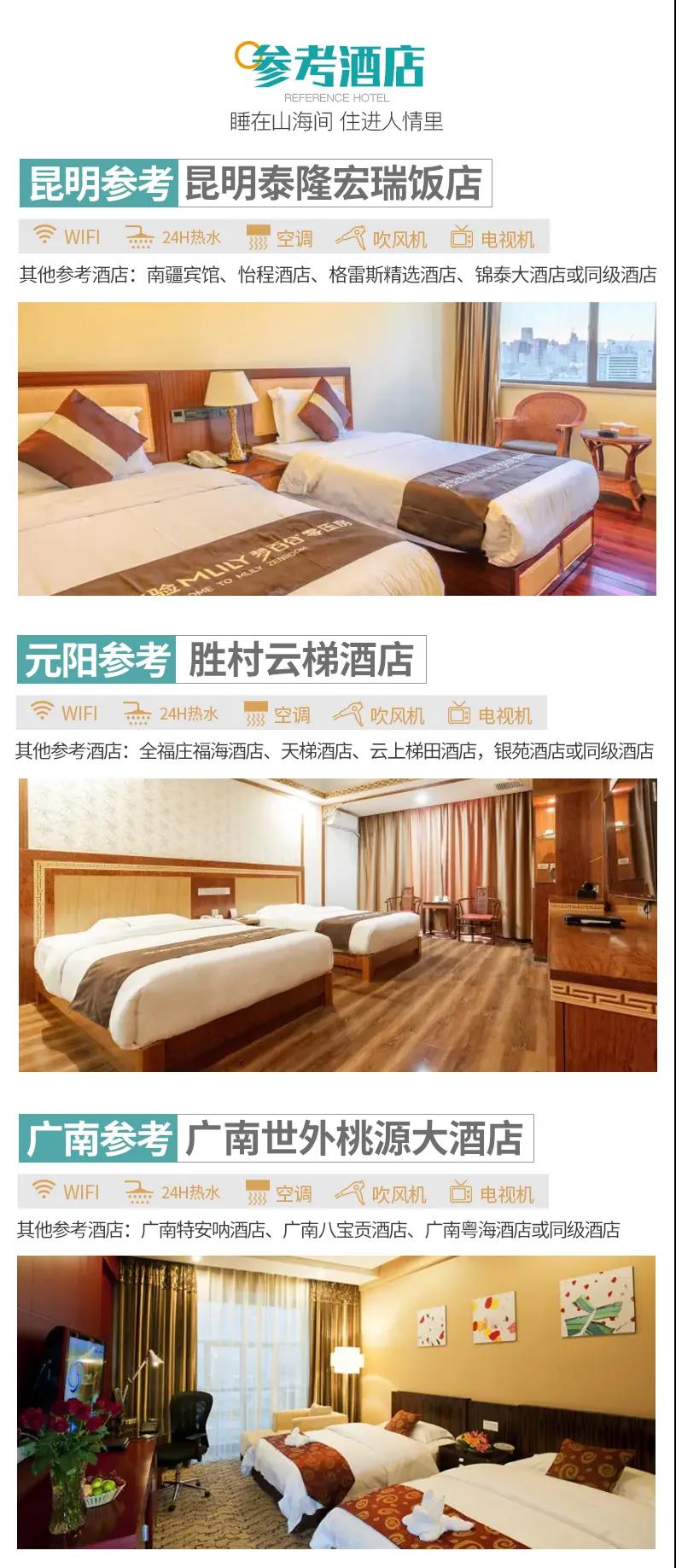 住宿 :行程所列7晚當地酒店標間,并贈送集合日昆明四星酒店一晚。元陽景區酒店標間2晚、廣南準四酒店1晚、彌勒準四星酒店標間1晚、羅平縣三星酒店1晚、普者黑景區精品客?;蚓频?晚(景區內住宿均為攝影農家客棧標準間,不帶星級;因沿途條件有限,如酒店設施達不到您的期望,請您諒解)
