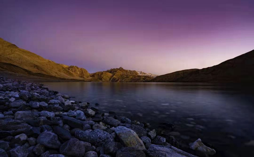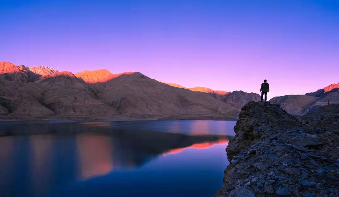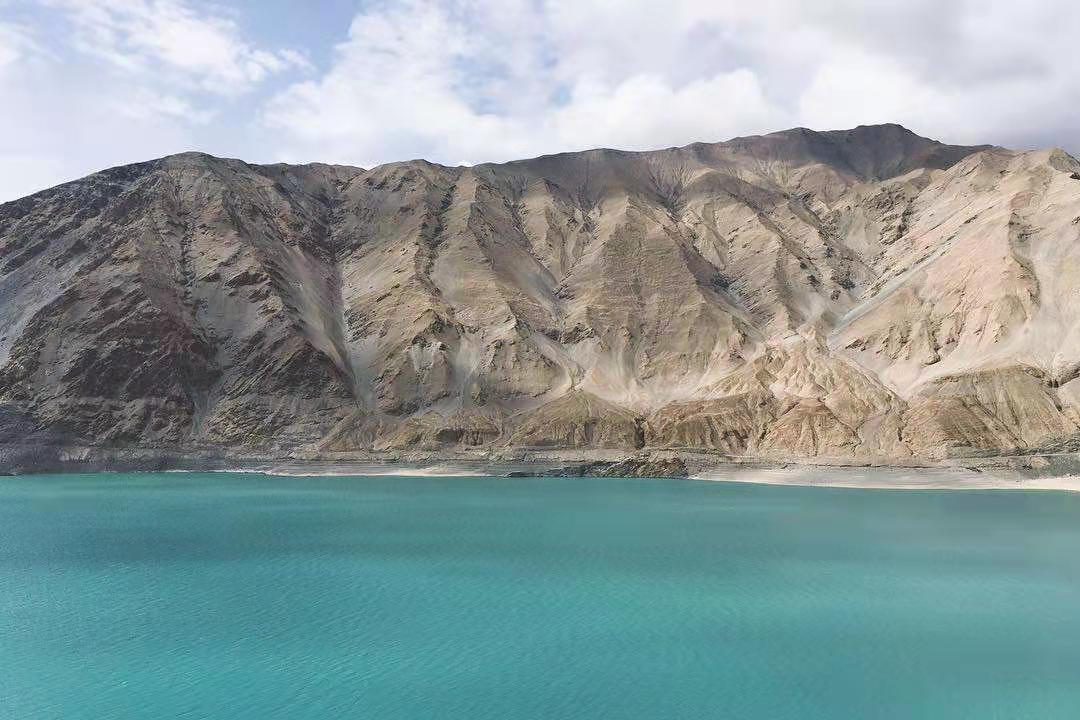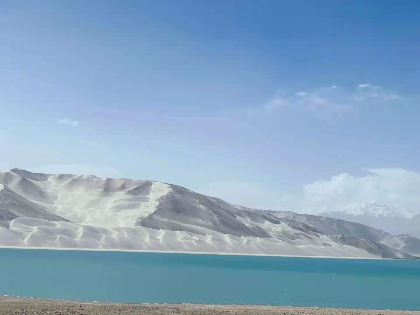 車子行進(jìn)在海拔三千多米的【蓋孜峽谷】中。喀喇昆侖公路像一條玉帶,沿著蓋孜河在蓋孜峽谷中穿梭著,眼前的景色又變成了綿延不絕的荒山雪嶺。此時(shí)突然出現(xiàn)的美麗湖泊便是【布倫口白沙湖】湖水在帕米爾高原潔靜的陽(yáng)光下,閃耀著金屬般的光澤。湖水在天空、白沙和雪山的綜合作用下呈現(xiàn)出一種別樣的藍(lán)。