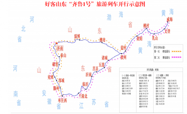 “齊魯1號”旅游列車由3條旅游線路組成。包括:濟(jì)南至棗莊西K8281次、棗莊西至威海K8282/3次和威海至濟(jì)南K8286/7次,全程停靠22個站點(diǎn),整體行程兩天。具體行程為: