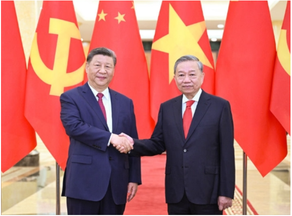 習近平指出,很高興對越南進行國事訪問,實現同蘇林總書記的首輪互訪。今年是越南共產黨成立95周年、越南建國80周年和南方解放50周年,我代表中國共產黨和中國政府向越方致以熱烈祝賀。中方將一如既往支持越南走好符合本國國情的社會主義道路,勝利召開2026年越共十四大,朝著建黨建國“兩個一百年”奮斗目標不斷邁進。