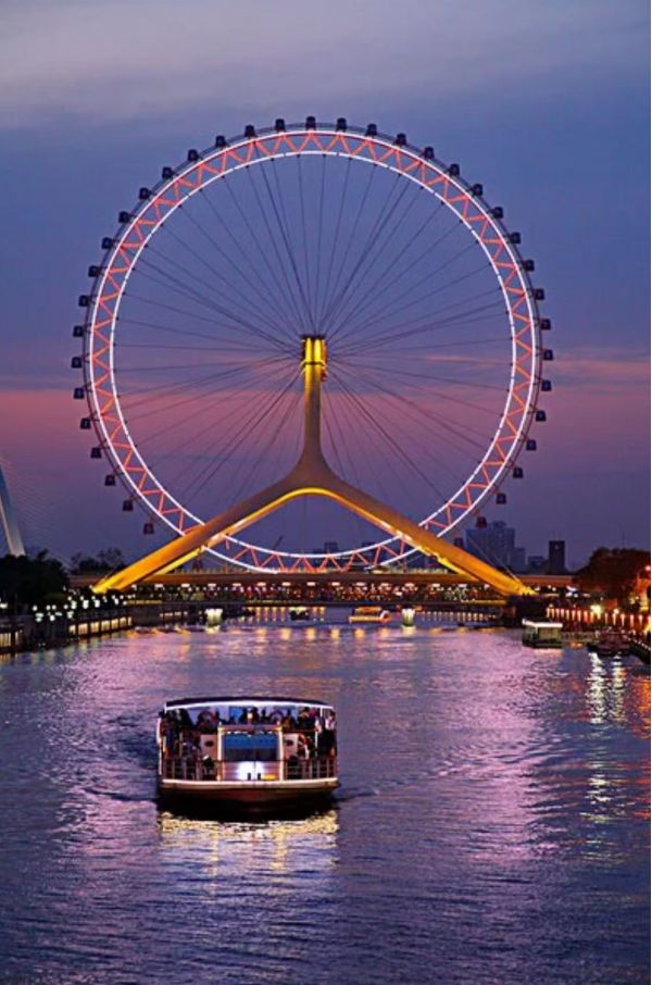 天津之眼”摩天輪,全稱天津永樂橋摩天輪,位于天津市河北區(qū)李公祠大街與五馬路交口,跨海河連接河北區(qū)與紅橋區(qū)。它是一座跨河建設(shè)、橋輪合一的摩天輪,也是世界上唯一一座建在橋上的摩天輪,兼具觀光和交通功用,是天津的地標(biāo)建筑之一。該摩天輪于2006年開始建設(shè),2009年4月16日正式開放,2010年12月10日被評定為