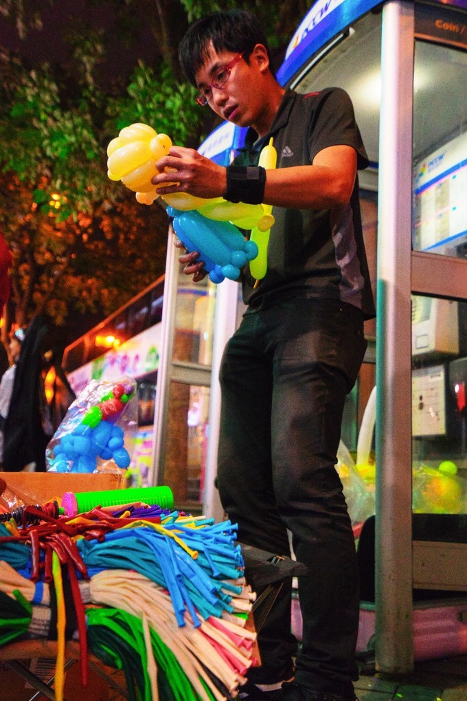 主角登場(chǎng)。這位小哥憑借靈巧的雙手,無與倫比的迅捷,以及來圖即興創(chuàng)作的本領(lǐng)俘獲了無數(shù)膝蓋,當(dāng)然還有花花綠綠的港幣。這是真本事,比旁邊那個(gè)不停做重復(fù)扭動(dòng)狀靠photo me來賺錢的歐吉桑有技術(shù)含量的多。在這“路邊攤”旁,我終于體會(huì)了一把好整以暇等待的愜意,而不用和老板一起提心吊膽、張皇四望,時(shí)刻準(zhǔn)備著為一句“城管來啦”而百米沖刺。