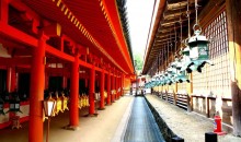 【春日大社】(約40分鐘)于768年為了守護(hù)平城京及祈禱國(guó)家繁榮而建造,是藤原氏一門的氏神,由武翁槌命乘鹿而來的傳說,把鹿作為神的使者,春日山的春日大社是日本全國(guó)各處的春日大社的總部,奈良公園與伊勢(shì)神宮、石清水八幡宮一起被稱為日本的三大神社,春日山作為春日大社的神山,千年以來都被禁止砍伐,因而遍布著以槲樹、米儲(chǔ)類樹木等為主體的常綠廣葉林的原始森林,由于春日大社從公元9世紀(jì)起禁止采伐樹木,原始林得以保護(hù),并作為與春日大社不可分離的景觀和春日大社一起被列入聯(lián)合國(guó)科教文組織的《世界遺產(chǎn)名錄》;
