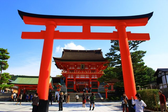 日本伏見稻荷大社建于8世紀,主要是祀奉以宇迦之御魂大神為首的諸位稻荷神。稻荷神是農業與商業的神明,香客前來祭拜求取農作豐收、生意興隆、交通安全。它是京都地區香火最盛的神社之一。