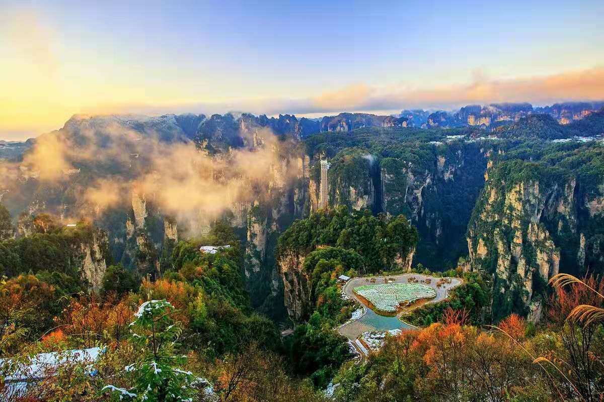 聚著30多座形態各異的峰林,仿佛一支神兵天將,藏于深山密林之中;空中田園坐落在天子山左側2000米的土家寨旁,海拔1000余米,版權所有山東聊城聊之旅國際旅行社有限公司,轉載必究!下面是萬丈深淵的幽谷,幽谷上有梯形良田,登上“田園”,清風拂袖,云霧纏身,如臨仙境;鴛鴦瀑布位于老屋場的西部,一條白練似的飛流從百余米的石崖頂瀉下,中間因石頭阻截,將水分成兩股,然后流入水潭融為一體,故稱鴛鴦瀑布。