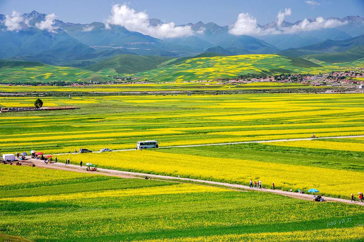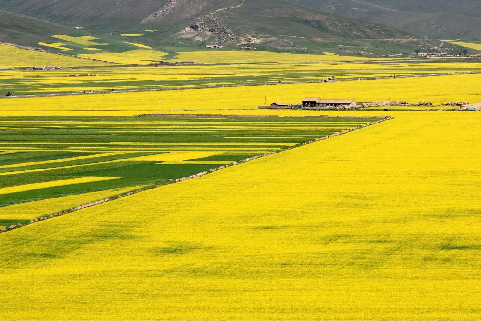 浩門河在中間流淌,這種景色就像鑲了兩道金邊的銀絲帶蜿蜒飄舞,與祁連山遙相輝映。在高原上常見的藍(lán)天白云襯托下,一望無際的金黃顯得異常斑斕,令人慨嘆,大色塊的簡(jiǎn)單構(gòu)圖給人豐富的遐想。喜歡油菜花的人都是喜歡那種強(qiáng)烈的色彩,喜歡那種撲面而來的恢宏氣勢(shì)。常言道:常在花間走,能活九十九。當(dāng)人步入花的世界,花迎花送,伴君千里。花香沁人心脾,觀之聞之似能解人苦樂,仿佛在輕輕訴說,猶如在歡愉地歌唱,恰似在喚起美好的回憶,又好像在安撫煩亂的思緒。踏青賞花,能領(lǐng)略到大自然的美,確屬快事一樁!下面,請(qǐng)大家觀賞一下咱門源的油菜花吧,它的那份壯觀在國(guó)內(nèi)其它地方確實(shí)是少有的。