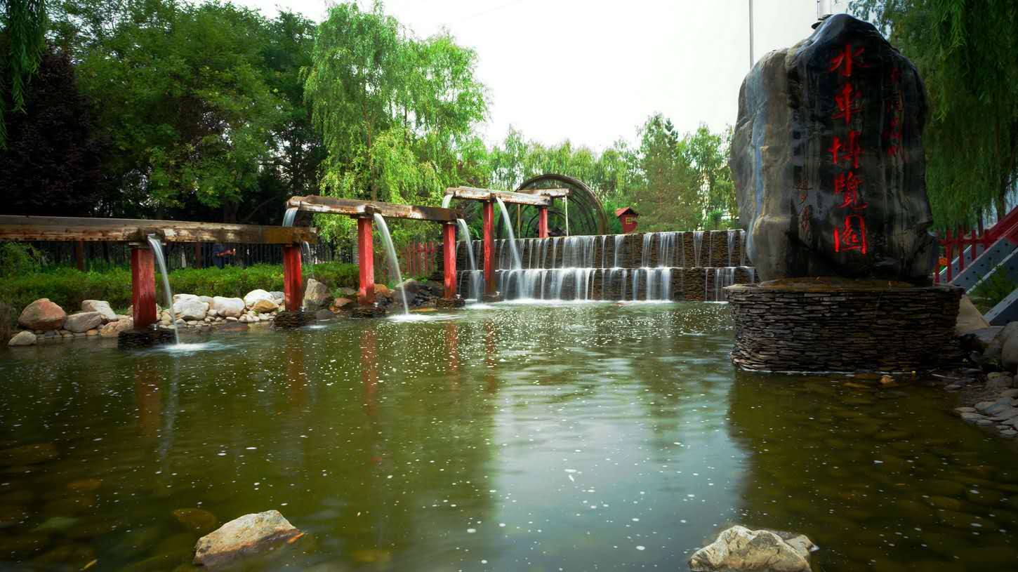 與水車廣場相連的是水車博覽園的第二部分——“水車園“。水車園以12輪蘭州水車為主景,是歷史上的“水車園“舊址。園內黃河奔騰,水車旋轉,渠水蜿蜒,各種花草樹木錯落有致,再現了黃河、水車與農業生產的和諧景象。