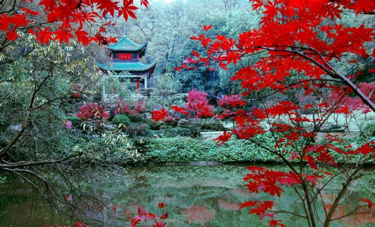 袁枚到了清風峽,只見這里三面環山,楓葉紅的像火,中間開闊處有座亭子,石柱子,琉璃瓦,飛檐高挑。亭子的匾額上寫著“紅葉亭”三個大字,柱子上刻了一副對聯:“山徑晚紅舒,五百夭桃新種得,峽云深滴翠,一雙馴鶴待籠來。”袁枚看了對聯,不住點頭,望望匾額,好像想說什么,又沒說出口來。他離開了清風峽,參拜了麓山寺,觀賞了白鶴泉,登上了 云麓宮,才興盡下山。