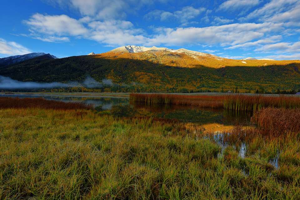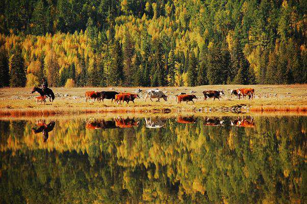鴨澤湖位于禾木喀納斯蒙古族鄉境內喀納斯村南邊,它是由喀納斯河改道后廢棄河段——牛軛湖洼地組成,呈長形蝶狀,沿洼地南端形成一個南北走向的寬淺湖泊,形似蝶狀的一弘碧水與沼澤濕地連為一體,面積約1.3 平方公里。