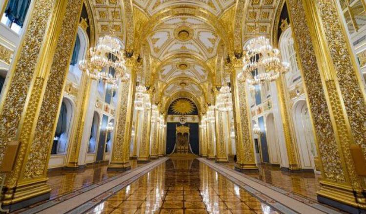 大克里姆林宮是克里姆林宮中的主要建筑之一。克里姆林宮墻內,朝向莫斯科河有三列高窗的漂亮建筑物就是大克里姆林宮,1839~1849年在舊宮原址上建造,由古老的安德烈夫斯基大廳和阿列克山德洛夫斯基大廳聯結而成。大克里姆林宮外觀為仿古典俄羅斯式,廳室全部建筑式樣多樣,配合協調,裝潢華麗。宮殿的正中是飾有各種花紋圖案的閣樓,上有高出主建筑物的紫銅圓頂,達13 米,并立有旗桿,節假日則升國旗。大克里姆林宮內部呈長方形,樓上有露臺環繞的總面積達2萬平方米的700個廳室。從前,第一層除了處理政務的處所以外,全是沙皇私人宮室,白色寬闊的樓梯通往二層各廳,這里有格奧爾基耶夫大廳、弗拉基米爾大廳和葉卡捷琳娜大廳,從前還有安德烈耶夫大廳,曾是沙皇接見使臣的地方。格奧爾基耶夫大廳是大克里姆林宮中最為著名的殿廳,是俄羅斯工匠巧奪天工的建筑杰作。大廳呈橢圓形,圓頂上掛著6個鍍金兩枝形吊燈。每個吊燈重1300千克,圓頂和四周墻上繪有15~1 9世紀俄羅斯軍隊贏得勝利的各場戰役的巨型壁畫。大廳正面有18根圓柱,柱頂均塑有象征勝利的雕像。如今,格奧爾基耶夫大廳是政府舉行歡迎儀式的傳統地點。
