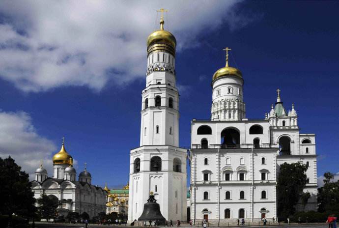 人們從遠處遙望克里姆林宮,不難發現有一座建筑高高地矗立在建筑群體中,有鶴立雞群之感。這個高大建筑就是教堂廣場上的伊凡大帝鐘樓。它高81米,是古時的信號臺和望臺。鐘樓的左側有重達40 噸的炮王,右側是著名的鐘王。這兩個龐然大物雖然從未使用過,但卻顯示出了俄羅斯工匠高超的鑄造技術。