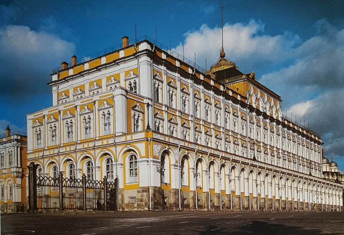 1838年,大克里姆林宮重建,全部由俄羅斯工匠采用本國建筑材料建成,外表看是三層建筑,實際是兩層,第一層向前突出,構成一個露天陽臺,后來作為蘇聯政府、蘇共中央和社會團體舉行會議的場所。