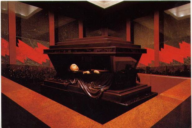 沿黑色大理石臺階而下,轉彎即進入陵墓中心――悼念大廳。大廳四周環鑲紅磚,墻壁上有用花崗石雕刻的蘇聯國徽和國旗。