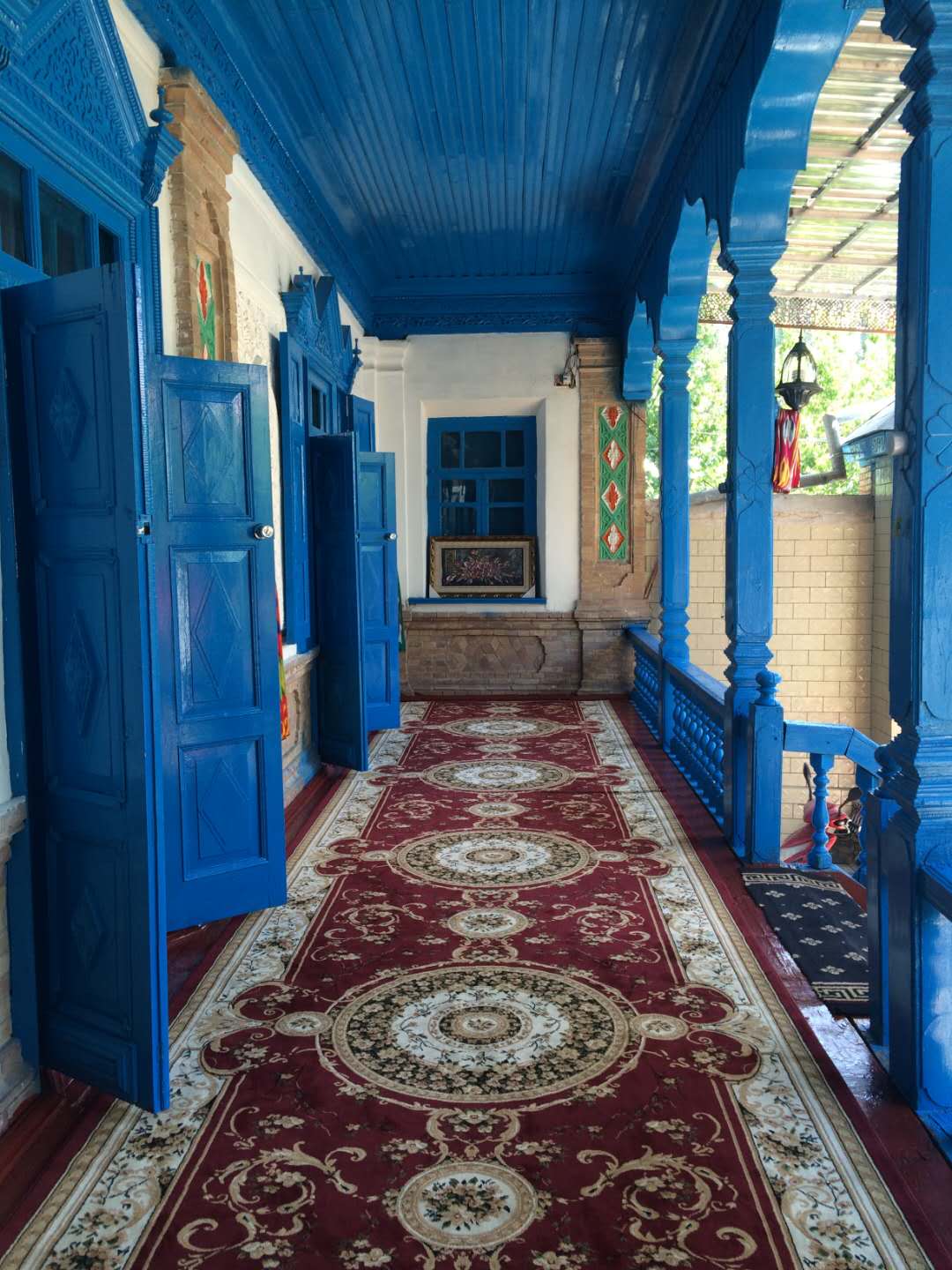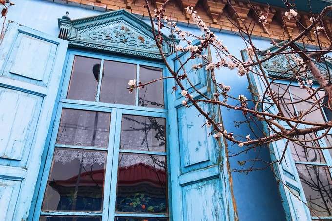 這里的民居與環(huán)境始終保持著較為完整的傳統(tǒng)風(fēng)貌與格局,頗具中西亞特色及“塔蘭奇”傳統(tǒng)文化風(fēng)格??澠涞姆课萁ㄖλ{(lán)色的使用頻率非常高,或者在外墻,或者在屋頂,更多時候是在門板和窗欞,藍(lán)色大都是主色調(diào),整個建筑顯得精致而純凈。