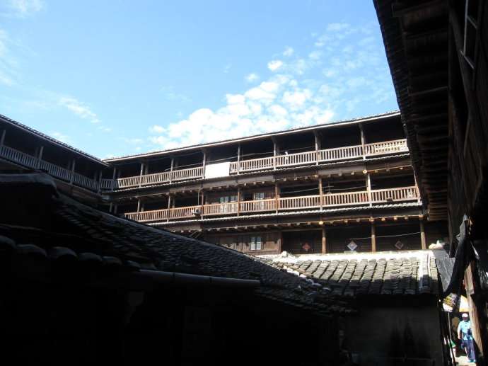亦有五鳳型,橢圓型,八卦型,永定最多,將近二萬多座。南靖亦有一萬五千多座。永定以客家人為主,南靖為閩南人.土樓內有水井和排水,門大多只有一個,多的有3個。房間的窗戶較小。遠處看去就是一個堡壘。門比較結實,大多包了鐵皮,晚上大門一關,非常安全。土樓的中間是祠堂,祠堂有的是獨立的。