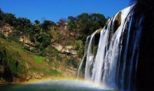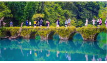 方村河伏流出露不遠,有一橫跨河兩岸的天然巨巖,是喀斯特是貌奇觀之一,谷稱天生橋,又謂仙人橋。高60米,厚10多米,橋孔寬20多米,河水流過橋后,還形成2米多高的大瀑布。仰觀橋孔下,只見巨型鐘乳懸掛,橋腳、橋側的裂隙石縫長出綠石草叢灌木,藤蘿花卉纏裹橋身,真是滿目琳瑯、五顏六色的天然大彩橋。橋下瀑布前水激浪涌,小船不能靠近,到此必須停船,把船扛在肩上攀登危巖,超過瀑布,又才能逆流行舟在暗河峽谷之中。此景驚險,別具一番樂趣。