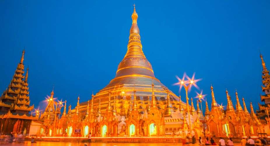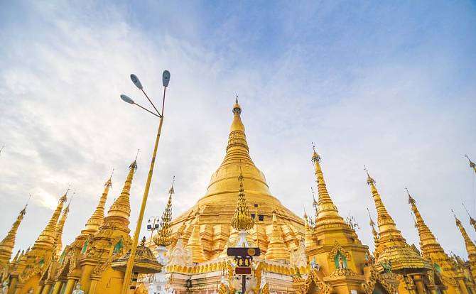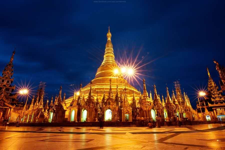 其高度為98米,表面則鋪上了一層金,再加上它是位于皇家圓林西的圣山(Singuttara)之上,所以這座塔也就在仰光市天際線中獨占鰲頭了。它是緬甸中最神圣的佛塔,因為它供奉了四位佛陀的遺物,包括是拘留孫佛(Kakusandha)的杖,正等覺金寂佛(Konagamana)的凈水器,迦葉佛(Kassapa)的袍及佛祖釋迦牟尼的八根頭發。全塔上下通體貼金,加上4座中塔、64座小塔,共用黃金7噸多!在塔頂的金傘上,還掛有1065個金鈴、420個銀鈴,上端以純金箔貼面,頂端鑲有5448顆鉆石和2000顆寶石。