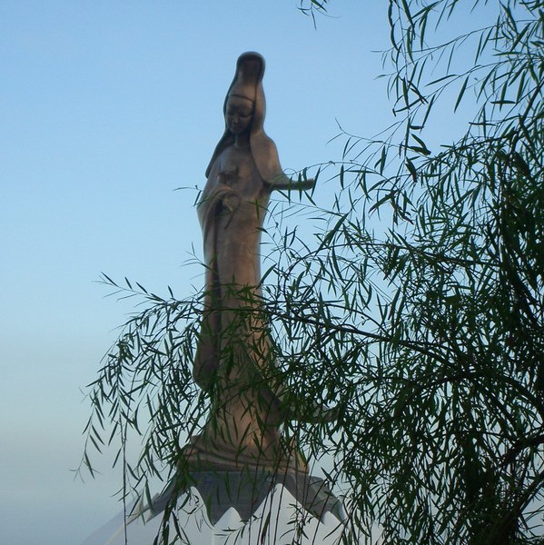觀音像高20米,整個蓮花座高7米,直徑為19米,由重50噸青銅制成。觀音蓮花苑以60米長的小橋與前面陸地連接,其座下的蓮花花瓣共十六枚。觀音像造型簡潔,雙手抱在胸間,衣裙輕拂,似緩步而行,顯現了優美線條與動感。觀音容貌安詳,遠看雙目閉合,近觀則眼睛正觀看世人。