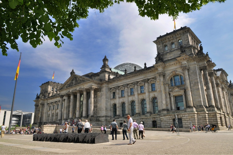 柏林的德國國會大廈建于1884年,由德國建筑師保羅·瓦洛特設計,采用古典主義風格,最初為德意志帝國的議會。1918年11月9日,議員菲利普·沙伊德曼通過國會大廈的窗口宣告共和國的成立。1933年2月27日大廈失火,部分建筑被毀,失火原因不明。“國會縱火案”成為納粹統治者迫害政界反對派人士的借口。二戰中,大廈遭到嚴重毀壞。1945年4月30日,蘇聯紅軍把紅旗插上國會大廈的屋頂,宣布了反法西斯戰爭的勝利。1961至1971年間,大廈按保羅·鮑姆加藤的設計方案重建。重建的國會大廈對建筑進行了簡化,省去了1945年被炸掉的大廈圓頂部分。這座曾位于柏林墻邊界上的大廈內曾辦有“德國歷史問答”展覽。該展覽遷至德國大教堂中。兩德統一之后,德國聯邦議會決定重新遷入國會大廈。1990年10月3日德國人民在國會大廈前慶祝了國家的重新統一,同年12月20日,第一屆全德聯邦議會確定柏林為統一德國的首都,國會大廈則被定為德國聯邦議院所在地。1994年至1999年,諾曼·弗斯特爵士以大廈最初的規模為藍本設計,對國會大廈進行了重新修建,建成為一座現代化的議會辦公大樓,新建的穹形圓頂供人游覽。1994年修復工程開始之前,國會大廈曾成為全歐洲最引人注目的藝術品。德國聯邦議院于1998年底遷入國會大廈,1999年在此選舉下一任聯邦總統。現曾讓人爭議一時的穹形圓頂已成為柏林城的新標志。