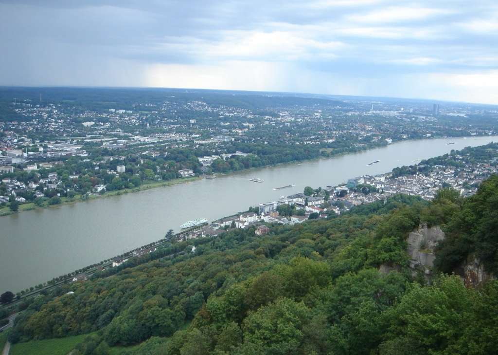 在波昂以下,河谷張開,進入一廣闊的平原,科隆舊城位于萊茵河的左岸。坐落于右岸的杜塞爾多夫(Dusseldorf)是北萊茵-西伐利亞煤田的首要商業中心。杜易斯堡(Duisburg)位于魯爾河口,大部分魯爾河運來的煤和焦煤以及進口的鐵礦石和石油,皆在此裝卸。