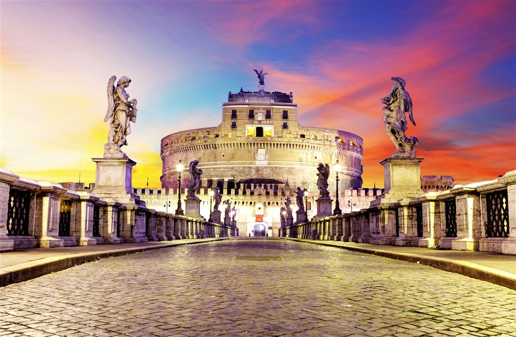 圣天使堡(Castel Sant’Angelo),位于意大利羅馬臺伯河畔,古羅馬地區(qū)的最西端,又稱哈德良陵墓(Mausoleo di Adriano).有數(shù)條橋可通往臺伯河西岸,較重要的一是伊曼紐爾二世橋(Ponte Vitttorio Emanuele Ⅱ),另一就是前往圣天使堡的著名橋梁(Ponte Santa Angelo)。由Bernini設計的這座橋可說是巴洛克式裝飾藝術杰作,不過橋上諸天使像中唯二兩座由Bernini親手雕成的雕像,已被移至Santa Adrea delle Fratte教堂內(nèi)妥為保存,改置兩座復制品于橋上。