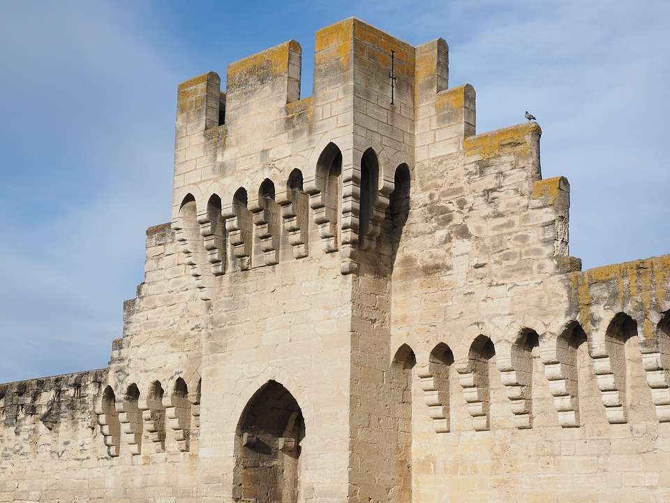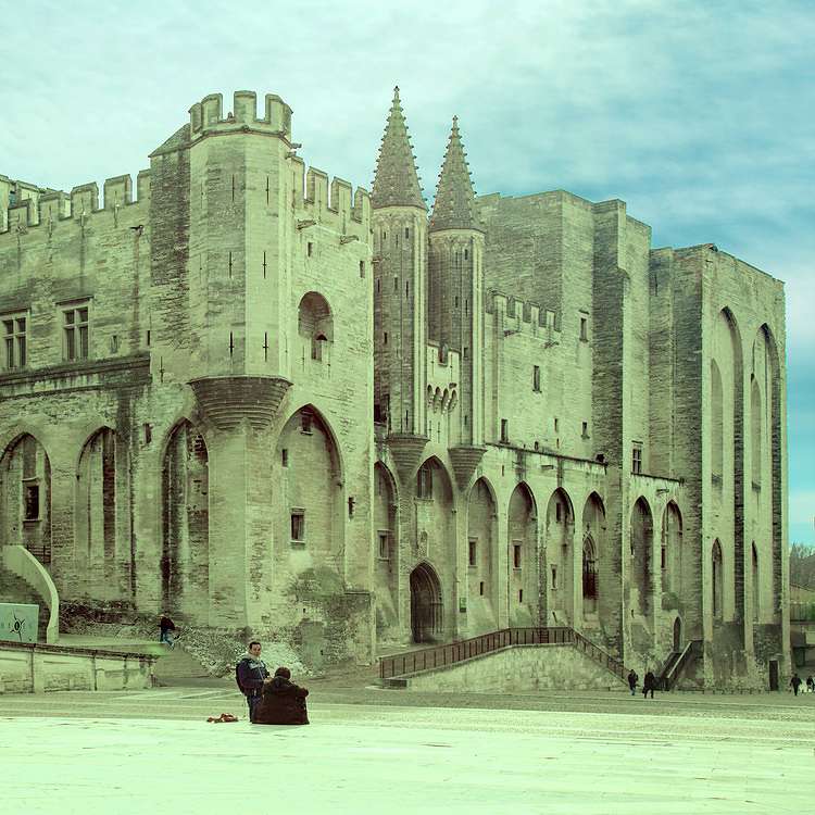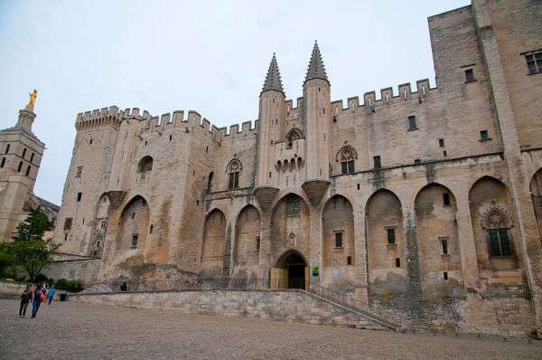 教皇宮(Palais des Papes) 由西蒙德 . 馬蒂尼和馬泰奧.焦瓦內蒂設計裝飾的羅馬教主宮,看上去是非常古樸的城堡,它俯視著這座城市,環城的城墻和 12 世紀遺留下來的橫跨羅納河的橋梁。這座突出的哥特式建筑下面的廣場上,小宮殿和圣母院教士的羅馬主教堂構成了一組特殊的紀念碑,他們顯示了阿維尼翁在 14 世紀基督化的歐洲所扮演的突出角色。