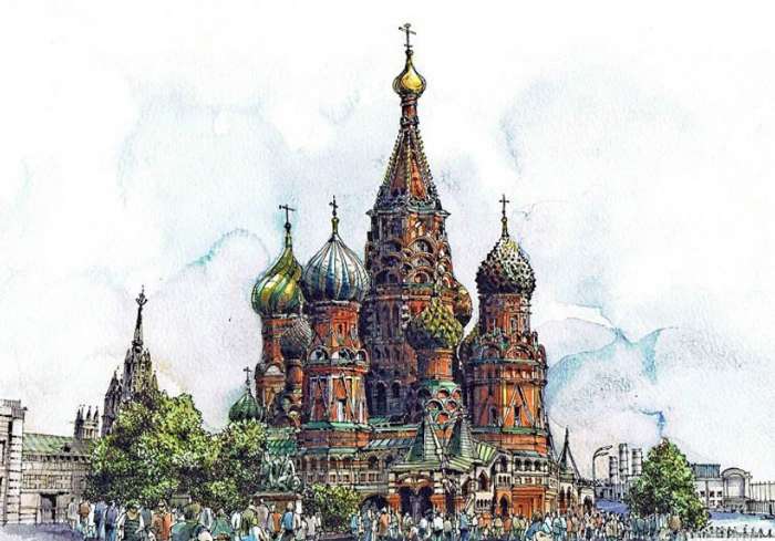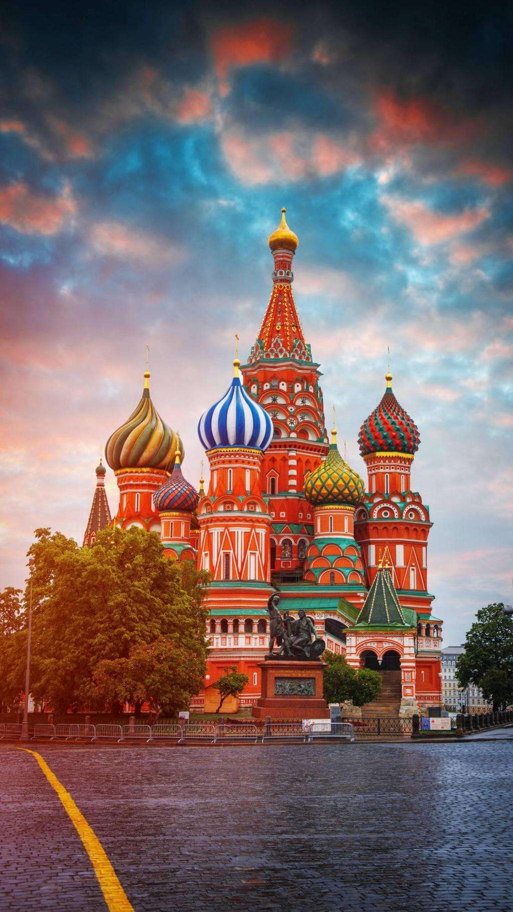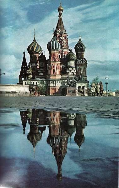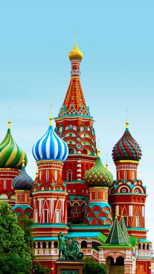 圣瓦西里大教堂于1553-1554年為紀念伊凡四世戰勝喀山汗國而建(由7個木制小教堂組成),并于公元1555年—公元1561年奉命改建為9個石制教堂,造型別致,多奇異雕刻,主臺柱高57米,為當時莫斯科最高建筑。