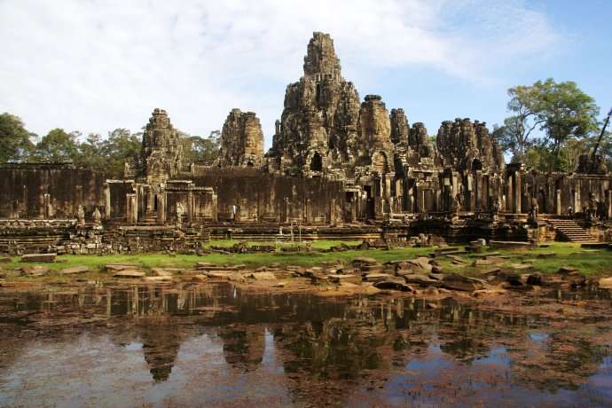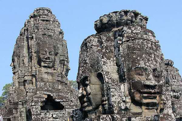 巴戎廟 位于柬埔寨暹粒,吳哥城內(nèi)最為出名的要數(shù)巴戎廟中的佛塔了,巴戎廟位于吳哥城的中心位置,巴戎廟是由一組共49座小寶塔圍繞中央尖塔構(gòu)成的建筑群,這些塔在佛語(yǔ)里又被稱做浮屠,每一座塔的四面都雕刻著巨大的佛面,也正因?yàn)槿绱耍@些塔又被稱作佛面塔,上面的佛被稱為四面佛。