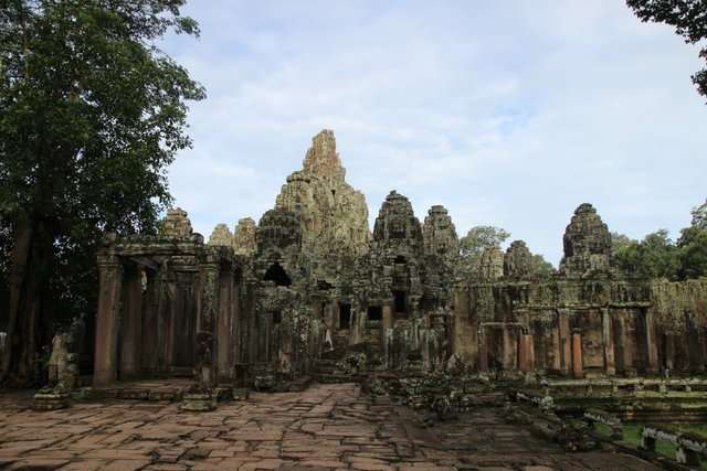 在茂密的叢林中,千回百轉(zhuǎn),灰白的石柱后,一個(gè)又一個(gè)黑白相間的斑駁石塔讓人又重回古代神秘圣土,四面佛那慈祥安定的臉部透出一份寧?kù)o與優(yōu)雅的神秘,拾起記憶的殘片,體會(huì)時(shí)光交錯(cuò)的震撼……