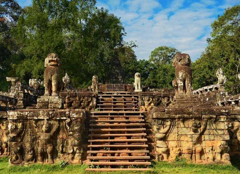 斗象臺(tái)為十二世紀(jì)晚期闍耶跋摩七世(Jayavarman VII)的巴揚(yáng)寺式(Bayon)建筑,臺(tái)的長(zhǎng)度超過(guò)三百米,共有三個(gè)平臺(tái)。