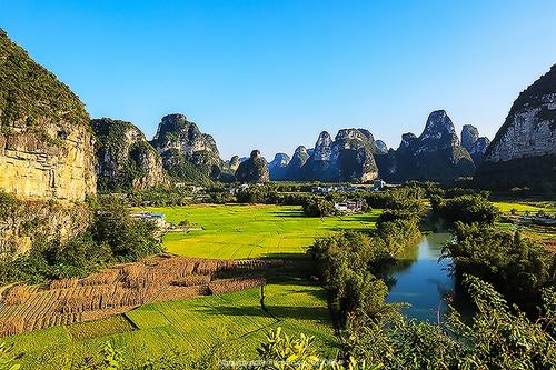 明仕田園位于靠近中越邊境的廣西省崇左市大新縣堪圩鎮(zhèn),距離南寧210公里,距離著名的德天大瀑布37公里。由于明仕田園距離大海不遠(yuǎn),又位于北回歸線以南的熱帶地區(qū)。這里一年四季高溫多雨,以石灰?guī)r為主體的山脈很容易受到水的侵蝕,大自然就以自己的偉力雕塑了明仕田園的喀斯特地貌。在大自然無聲寂靜的歲月流逝中,明仕田園的山總是傍著水,水總是環(huán)繞著山,山總是點(diǎn)綴著水,水總是倒映著山,形成了處處奇峰、山水相映的中國(guó)山水。有人放言,在名仕田園沒有真正的攝影家,因?yàn)殡S便一拍,皆是風(fēng)光迤邐的水墨山水。