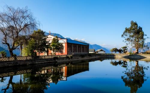 老姆登教堂,青磚墻,紅漆木窗,白鐵皮屋頂,簡單樸素。從外表看,這座教堂并不壯觀,沒有常見的玻璃彩窗、穹頂、和標志性的哥特式尖塔,有的只是長條凳和紅漆木窗,但這更顯出人們信仰的純粹和虔誠。每個星期天(周三、周六晚上八點亦有),周邊鄉村的基督教信徒都會集中在這里做禮拜,他們聚集在這里虔誠的念誦贊美詩,對于那些和著太陽和泥土味道的樸實的人民,上帝就住在他們心里,他們像呼吸一樣自然安詳虔誠的哼出那些歌謠。村民唱圣歌是用傈僳語唱的,傈僳族的文字始自圣經的翻譯,也為怒族所共用。