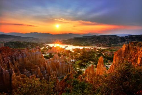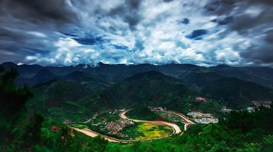 怒江,流經(jīng)云南貢山縣丙中洛鎮(zhèn)日丹村附近,由于王箐大懸?guī)r絕壁的阻隔,江水的流向從由北向南改為由東向西,流出300余米后,又被丹拉大山擋住去路,只好再次調(diào)頭由西向東急轉(zhuǎn),在這里形成了一個(gè)半圓形大灣,稱為怒江第一灣。灣中心有一個(gè)村子叫坎桶村,這里江面海拔1710余米,氣勢(shì)磅礴,灣上怒江臺(tái)地平坦開闊,高出怒江500米,構(gòu)成三面環(huán)水的半島狀小平原,小平原四周景物宜人。
