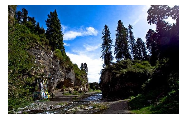 沿湖岸款步前行,越來越窄,轉過峽谷就看到小溪的源頭了,源頭從崖兩邊幾眼泉眼中潺潺涌出,清清淺淺地淌在碎石灘下,你不妨喝上兩口,這可是自然界中的純凈水,源頭之水,喝了會讓你感到一股沁人心脾的感覺。當地百姓管這泉水叫“乃溪”(圣水),是白龍江的源頭。此泉冬暖夏涼,天旱不枯,暴雨不澇,四季清澈見底。站在石灘上向左上方看去,在險峻的山坡上有一個洞穴俯視著泉眼,居高臨下,虎踞雄威,這就老虎洞。傳說這峽谷曾住著一條善良的白龍在此修道。有一年,山谷中突然發生了一場大火,大火蔓延,燃毀了樹林和莊稼,百姓無家可歸。正在修練的白龍見狀,想去拯救百姓,可神靈卻把它困在了巖石下,急得白龍渾身發抖黯然淚下,兩眼涌出一串串淚珠,淚珠沖破巖石,撲來了大火。從此這兩眼泉水再沒有間斷過,得救的百姓為感謝白龍的4恩德,便把從這泉眼中流出的河取名“白龍江”。從那以后,白龍江兩岸林木茂盛,人畜興旺。然而好景不長,一頭白額大虎常常從森林中出來傷害生靈。人們死的死,逃的逃,非常凄慘。一天,惡虎正在窮追來不及逃散的人們時,空中飄來一位慈祥的“仙女華爾旦納摩”,她用智慧降伏了惡虎,并把老虎關在石洞內,讓它日夜守護在白龍江源頭。人們過上了安居樂業的生活,而仙女“華爾旦納摩”因私自下凡而回不了天庭,就住進了仙女洞。從此這地方便有了“達倉納摩”這個美麗的名字。(藏語中虎穴叫“達倉”,仙女叫“納摩”)。連后來的格爾底寺也有“達倉納摩寺”之稱。