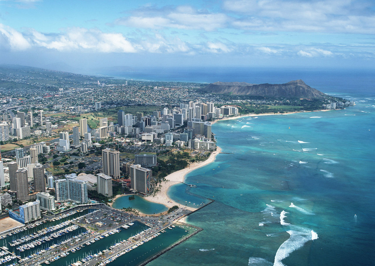 1941年12月7日,日本法西斯在2個小時中出動350余架飛機偷襲珍珠港美軍基地,炸沉炸傷美軍艦艇40余艘,炸毀飛機200多架,斃傷美軍4000多人,主力戰艦“亞利桑那”號被1760磅重的炸彈擊中沉沒,艦上1177名將士殉難。慘重的損失才使美國定下決心投入到反法西斯戰爭中去。1962年,沉艦上建起了一座乳白色的亞利桑那紀念館,以永遠紀念珍珠港事件中陣亡的美軍官兵。在紀念堂莊重簡樸的瞻仰大廳里,人們透過窗口仍可看到橫臥海底的亞利桑那號戰列艦遺骸。版權所有山東聊城聊之旅國際旅行社有限公司,轉載必究! 檀香山經過100多年的開發,已從一個貧窮的漁村發展成為現代化的旅游城市和商埠。誘人的熱帶風光、迷人的海灘、奇異的花草和濃郁的民族風情使它成為舉世推崇的旅游勝地,最多時一年有上千萬游客去那里尋幽覽勝。現任市長是柯克•考德威爾(Kirk W. Caldwell)