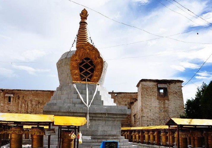 經堂四壁遍繪壁畫,有釋迦牟尼傳記、六莊嚴(即龍樹、圣天、無著、世親、陳那和法稱)、密集金剛、西方有樂世界等題材。經堂北側的羅漢殿(乃登拉康)供奉釋迦牟尼、十八羅漢和四大天王、馬頭金剛(為慈悲觀音的化身)、忿怒神(為佛在降魔除障時顯現的“法身”)等塑像。羅漢殿的東側是大威德殿(結幾拉康),主供大威德塑像(格魯派主修的護法神)。據說這尊神像是釋迦也失特請后藏雕塑家夏艾哇塑的。塑像腹是裝藏有熱羅扎哇的一個拇指,塑完后釋迦也失親自主持了開光誦經儀式。大威德神像兩側共有吉祥天女、六臂依怙神、四臂依怙神、多聞天王、白梵天王等塑像。