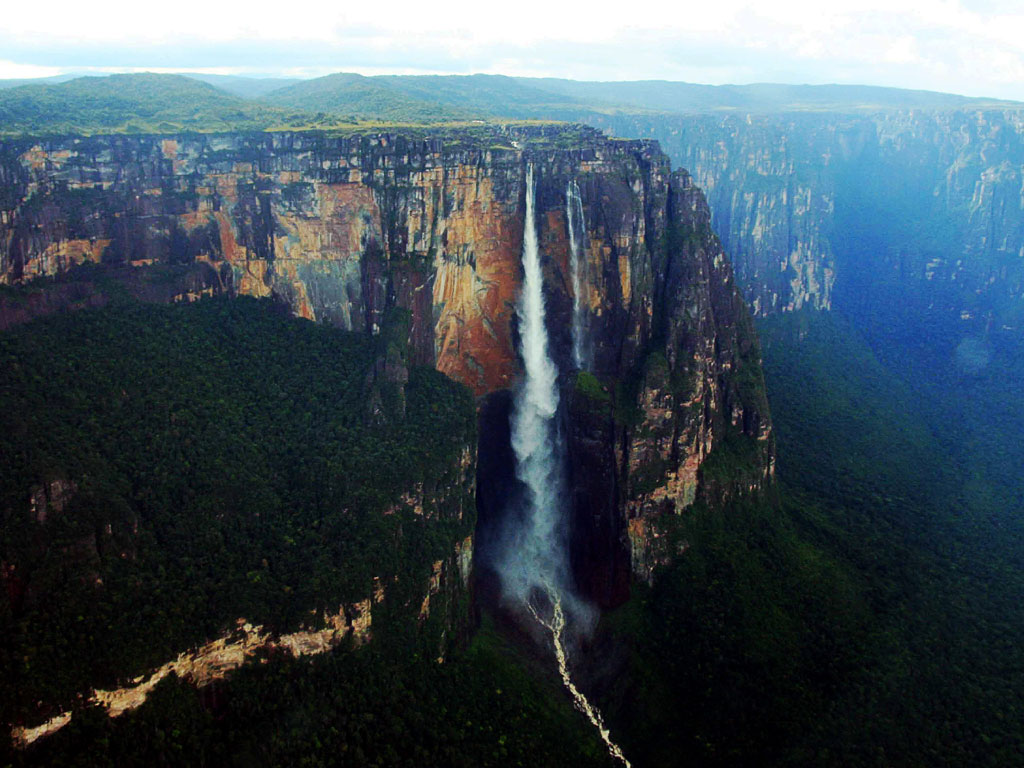 安赫爾瀑布是世界上最高的瀑布,丘倫河水從平頂高原奧揚特普伊山(Auyan-tepui)直流而下,寬150米,總落差979米(3122英尺),以離丘倫河谷地172米的分結(jié)晶巖平臺為界,瀑布分為兩級,而最長一級瀑布高807米(2648英尺)。