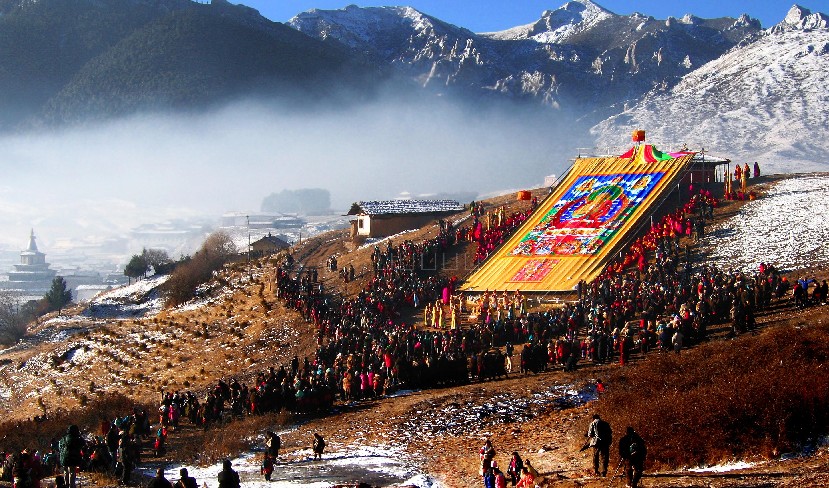 其中有1757年清代乾隆皇帝賜予該寺鑲滿金銀珠寶、書有漢滿蒙藏四種文字的盔甲,國家特級文物、純金汗書寫而成的藏文《大藏經》中的整套《甘珠爾》佛經,由十六羅漢和四大天王等組成的整套二十四幅的緙絲唐卡“唐繡”,這些文物都展示出明清兩代中央政府和西藏地方之間的親密關系。其中二十四幅要展示三周,形成了該寺一年一度規模盛大的“甘丹繡唐節”。