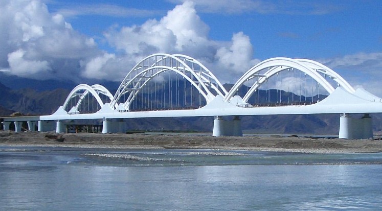 拉薩河特大橋是青藏鐵路的標志性工程,全長928.85米,最大跨度為108米 ,主橋采用五跨連續(xù)橋梁和中間三跨連續(xù)鋼拱組合體系,主跨采用雙層彎拱結(jié)構(gòu),這兩項均為國內(nèi)首次使用,在同類橋梁中處于世界領(lǐng)先、亞洲第一的地位。該橋的主橋橋墩設(shè)計為牦牛腿式變截面雙圓柱墩,引橋橋墩設(shè)計為雪蓮花式變截面圓端形墩。大橋設(shè)計結(jié)構(gòu)新穎,融民族特色與現(xiàn)代風格于一體,建成后大橋通體白色,連續(xù)的拱形猶如一條飛揚的哈達與金色的布達拉宮遙遙相望。
